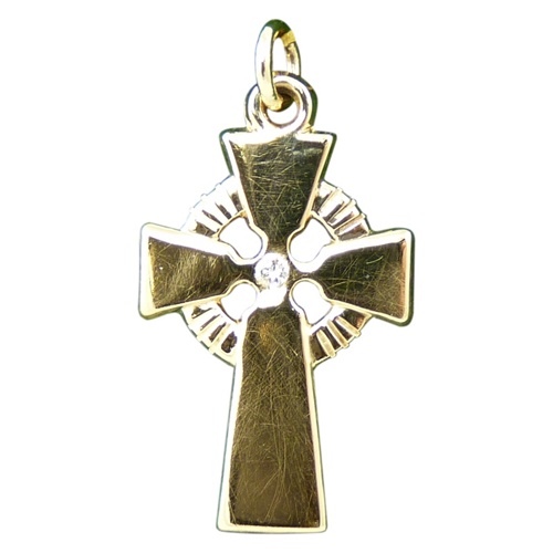 This Beautiful Celtic Cross pendant features a single diamond atop a polished cross. Cross is suitable for men or woman. . This piece is truly an exceptional way to showcase your faith. A stunning touch of Irish heritages! 14K gold ladies length 18" Box Chain included.