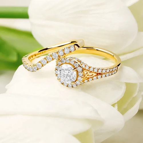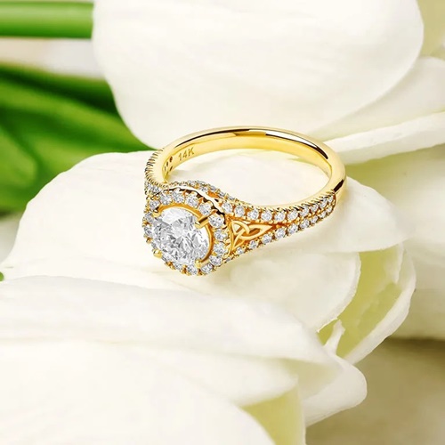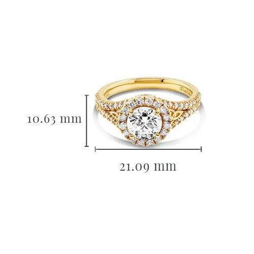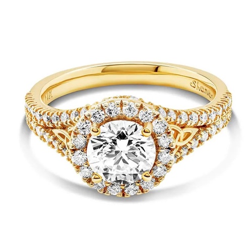 Shanore's 14K Yellow Gold Round Halo Celtic Trinity Knot Engagement Ring with 2ct center Lab Grown