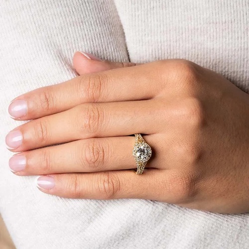 diamonds encircles the central gemstone. Further, the ring mount has split shanks lined with more