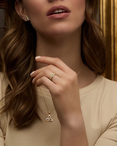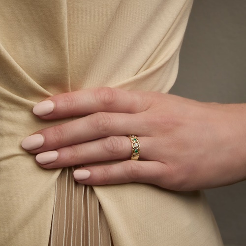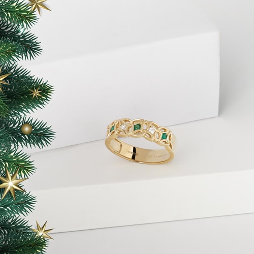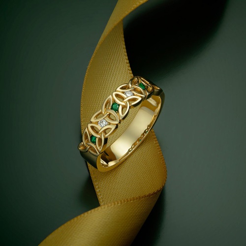 This Celtic Trinity Knot Band crafted in solid 14k yellow gold with 0.168ct Emeralds and 0.064ct Diamonds. 5.5mm wide The exquisite Trinity Knots Ring symbolizing never-ending-love. The 1/4" wide Irish band is gift boxed and is made in Dublin, Ireland.