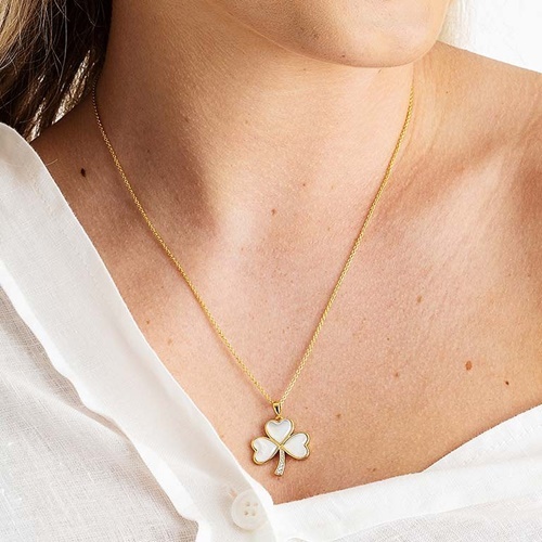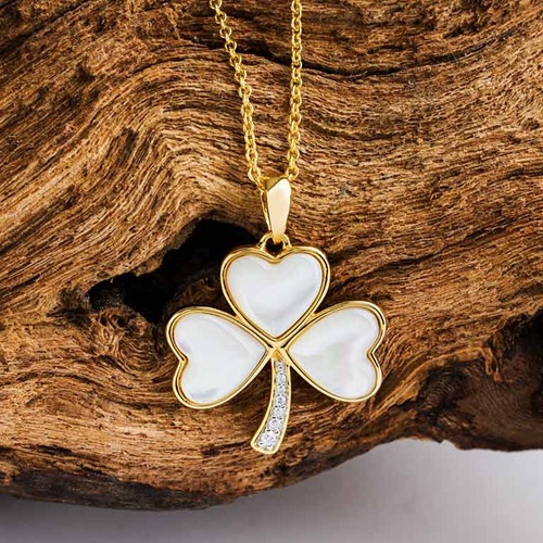 (2.5 microns) of genuine 14k gold. The pendant features a delicate three-leaf Shamrock minutely