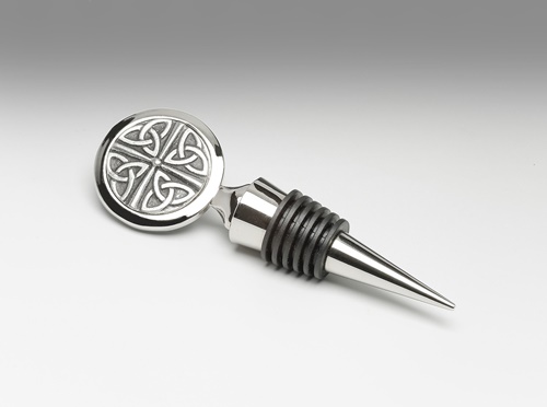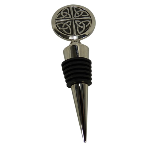 A pewter/stainless steel wine stopper with 4 Trinitys design.