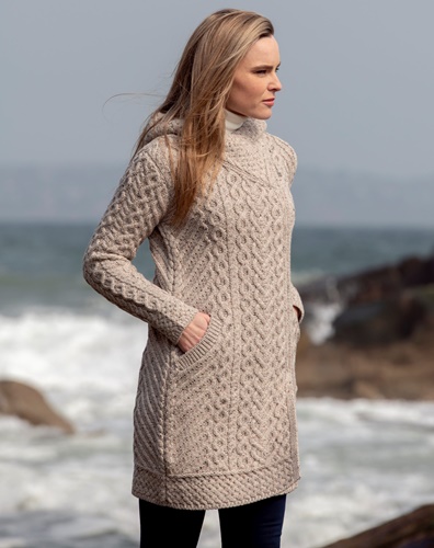 features a Celtic trinity knot design on the zipper. Wonderful piece of Irish Knitwear. Hooded Coat