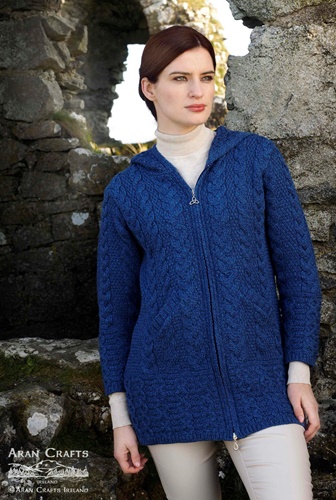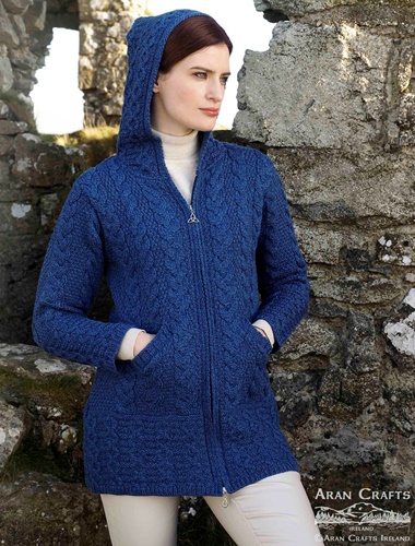 This three quarter length, Irish knitted sweater coat with double zip, comes in a range of
