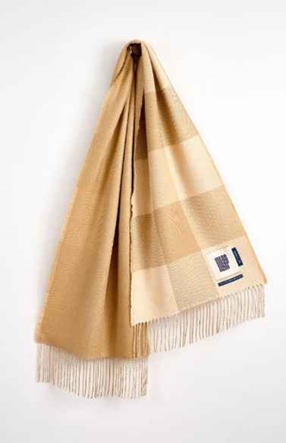Bold block plaid in cream and camel gives this scarf a sculptural edge, softened by the fluid