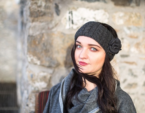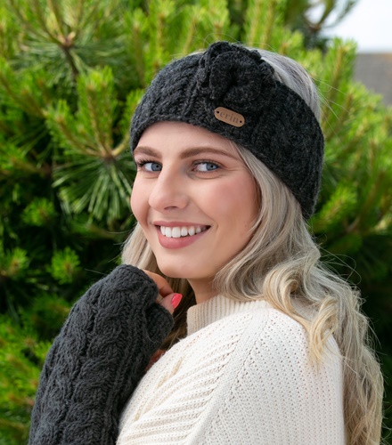 Aran Cable Knitted Headband in Charcoal color 100% Wool with Polyester fleece lining for extra