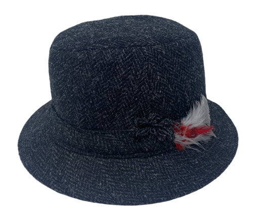 feathers on the brim complement the colorful flecks in the tweeds.