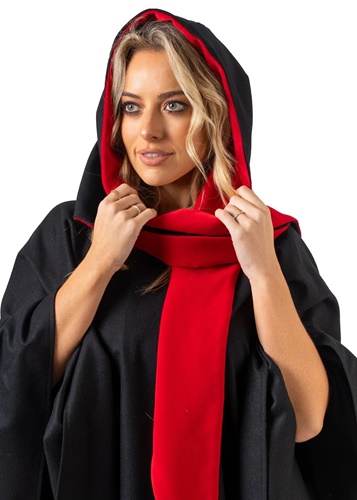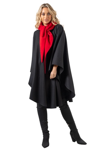Knee length cape a Cashmere/Wool blend 65% Pure "pearl-hilighted-word">New Wool,20% Cashmere,15% Polyamide. The attached scarf istrimmed with matching velvet and conveniently converts to a hood - making this style veryversatile.