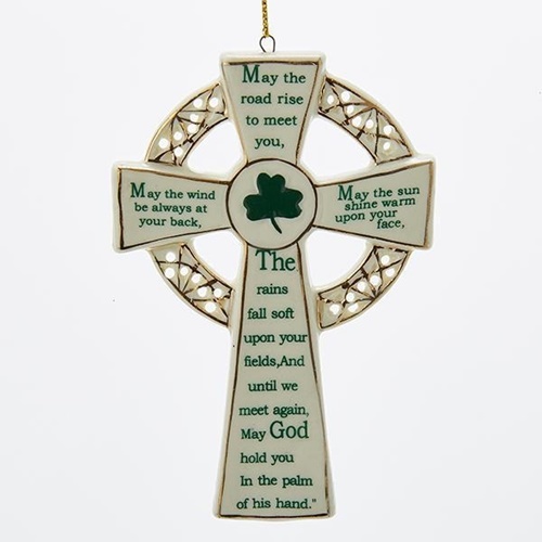 This Kurt Adler porcelain Irish cross ornament is a beautiful way to add to your holiday decor and bring Irish blessings to your home. Its white porcelain design cross design is circled with a Celtic knot and displays and Irish blessing in green print: "May he road rise to meet you, may the wind be always at your back, may the sun shine warm upon your face, the rains fall soft upon your fields and until we meet again, may God hold you in the palm of his hand."