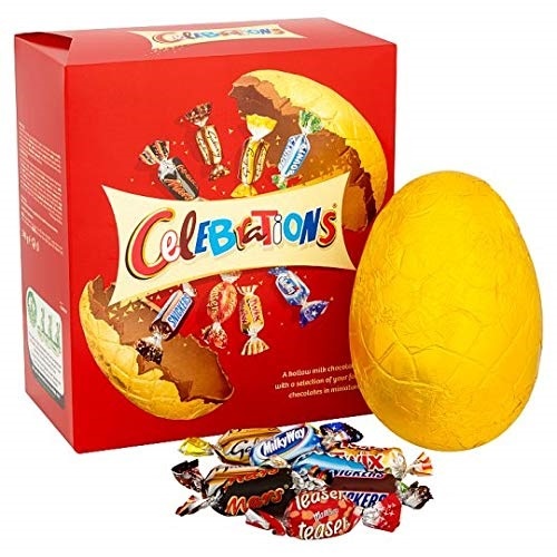 Celebrations Large Easter Egg is a hollow milk chocolate egg with a selection of your favourite chocolates in miniature. A great gift and fun to share with friends and co-workers. Celebrations Large Easter Egg will have you hopping with delight with its rich milk chocolate shell filled with an array of bite-sized chocolates. Suitable for vegetarians.