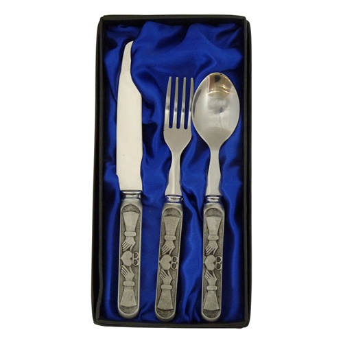 Beautifully boxed set of childrens pewter utensils feature a Claddagh design on the handle