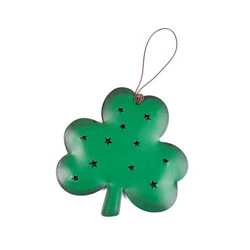 décor. Made from tin and measuring 3.25" x 3.25", this ornament features a classic shamrock design