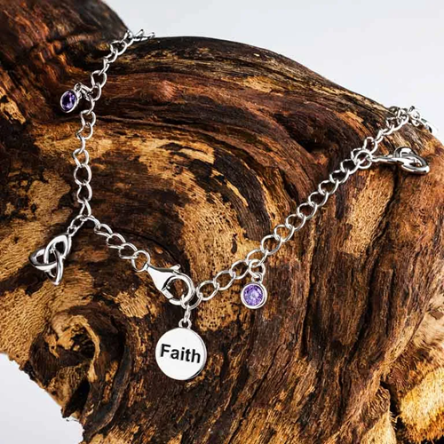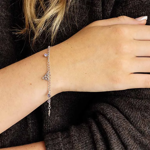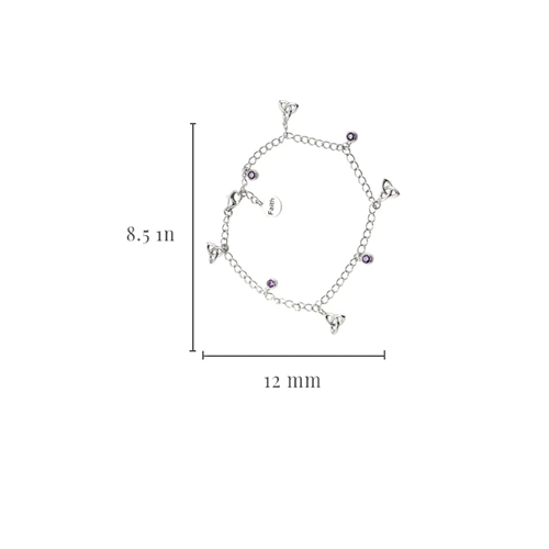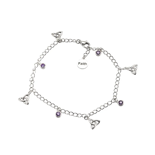 Shanore’s Sterling Silver Celtic Trinity Knot Bracelet with Amethyst Cubic Zirconia charms is a